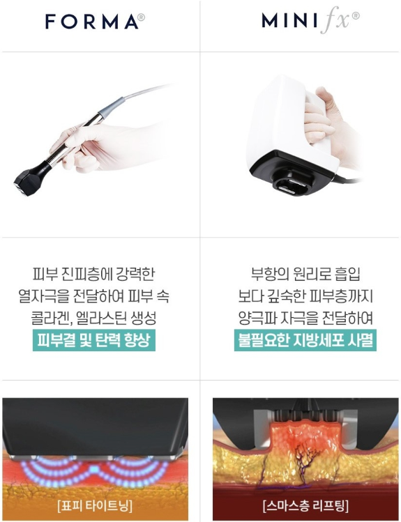 - FORMA 핸드피스: FORMA 핸드피스는 진피층의 콜라겐 생성을 촉진하고, 피부 탄력을 개선하는 역할을 합니다. 또한, 이 핸드피스는 피부결과 피부 잔주름을 개선하는 데에도 도움을 줍니다.