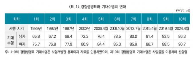 31일 생명보험회사의 경험통계를 바탕으로 지난해 12월 보험개발원이 발표한 제10회 경험생명표에 따르면 남성 평균수명은 86.3세, 여성은 90.7세로 지난 생명표보다 각 2.8세, 2.2세 늘어났다. 지난 1989년부터 사용된 경험생명표는 평균 사망률·위험률 등을 정리한 통계로 보험사의 보험료 산정에 쓰인다.