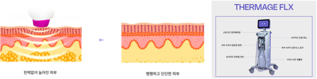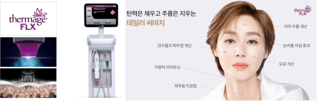 최신 업그레이드된 4세대인 써마지 FLX는 미국 FDA의 승인을 받은 장비로, 피부 속 콜라겐 밀도를 높여주어 피부를 조여주고 타이트닝으로 주름 및 탄력개선 및 피부 리모델링 효과는 얻는 RF 리프팅입니다.